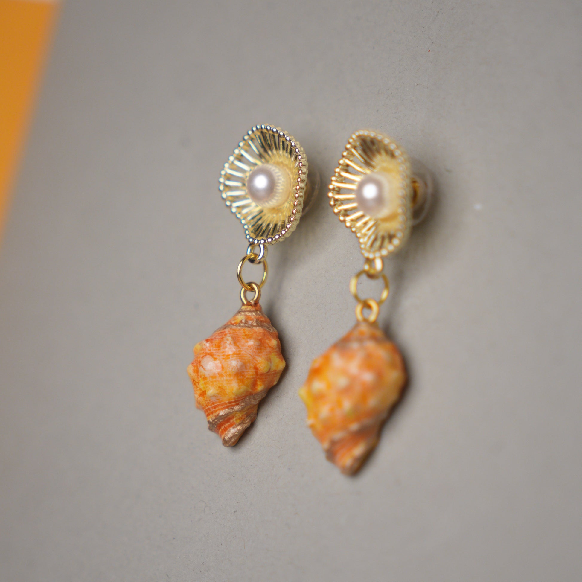 These statement earrings feature beautifully detailed gold sunburst studs with a delicate pearl center, paired with handmade and hand-painted shell charms. Each shell is uniquely painted, making every pair one of a kind — just like nature intended.