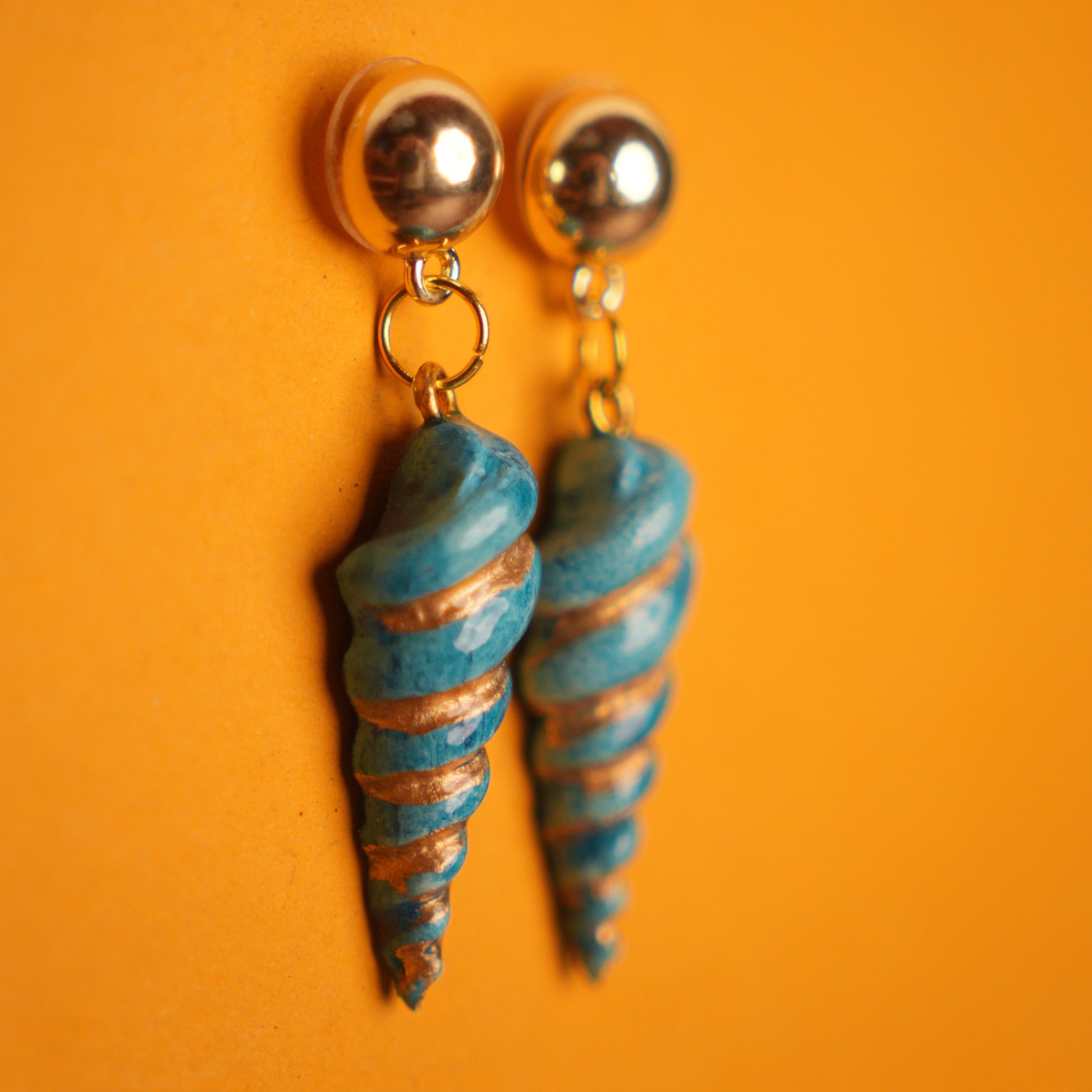 These stunning earrings feature glossy gold studs paired with beautifully handmade and hand-painted spiral shell charms in vibrant turquoise with delicate gold accents. Each shell is individually crafted and painted, making every pair truly one of a kind.